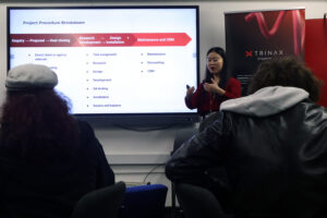 Following an introduction to Trinax’s work, students explored live technology demonstrations and were guided through the key elements of building an effective client pitch. They were then set a live brief, working in teams to develop and deliver their own pitch presentations, putting their ideas and communication skills into practice.